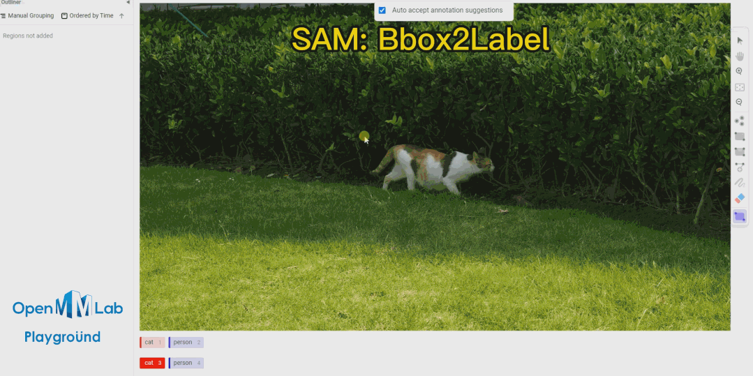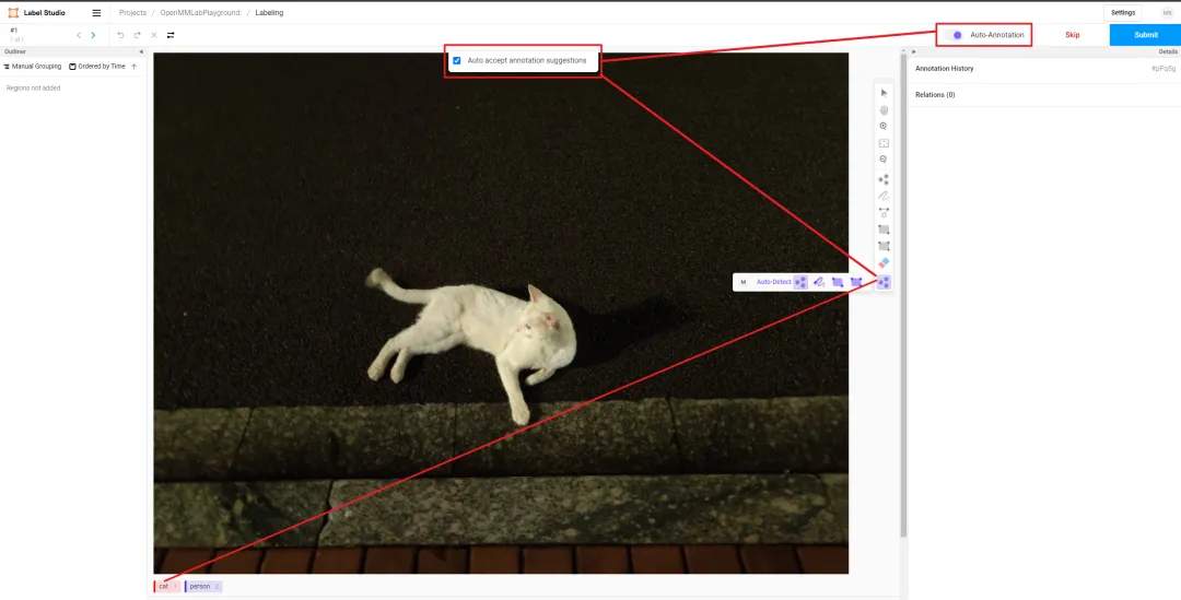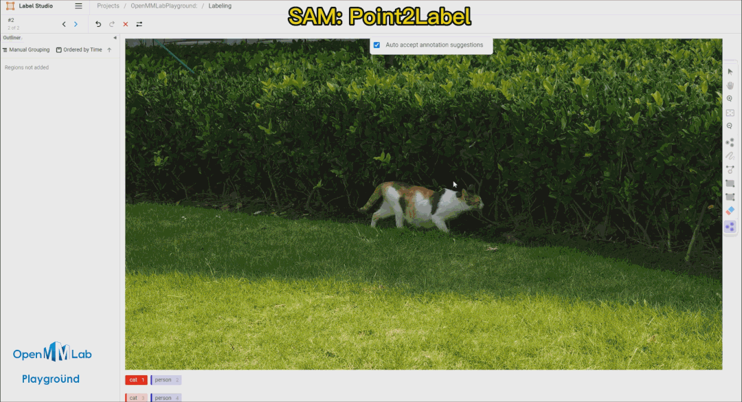 需要打开 Auto-Annotation 的开关,并建议勾选 Auto accept annotation suggestions,并点击右侧 Smart 工具,切换到 Point 后,选择下方需要标注的物体标签,这里选择 cat。如果是 BBox 作为提示词请将 Smart 工具切换到 Rectangle。