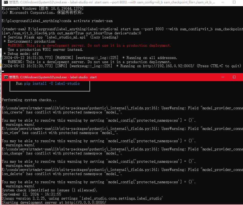 启动项目 1 2 3 4 5 6 7 8 9 10 11 12 13 14 conda activate rtmdet-sam label-studio-ml start sam --port 8003 --with sam_config =vit_b sam_checkpoint_file =./sam_vit_b_01ec64.pth out_mask =True out_bbox =True device =cuda:0 label-studio-ml start sam --port 8003 --with sam_config =vit_h sam_checkpoint_file =./sam_hq_vit_h.pth out_mask =False out_bbox =False device =cuda:0 set ML_TIMEOUT_SETUP =40 label-studio start