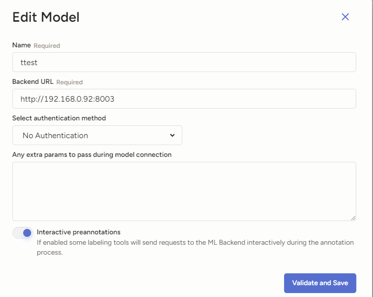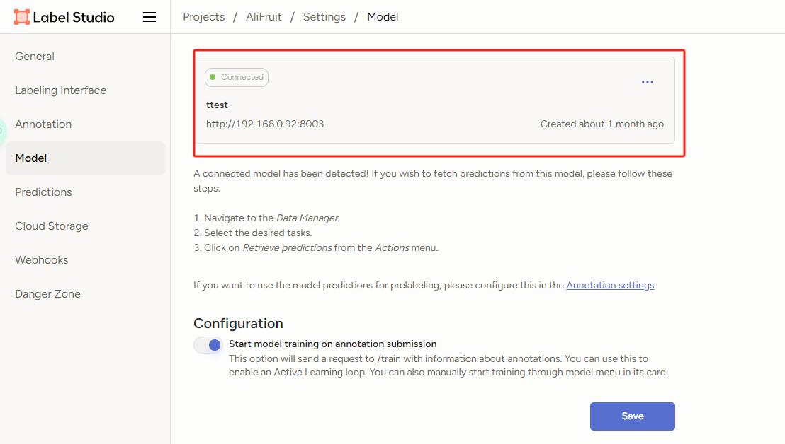 配置自动化标注模型 然后在设置中点击 Add Model 添加 OpenMMLabPlayGround 后端推理服务,设置好 SAM 后端推理服务的 URL,并打开 Use for interactive preannotations 并点击 Validate and Save。
